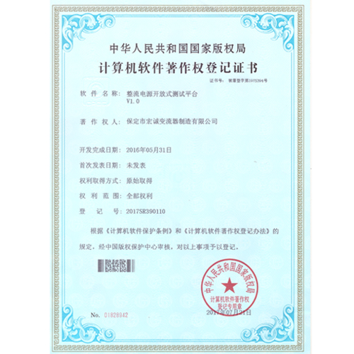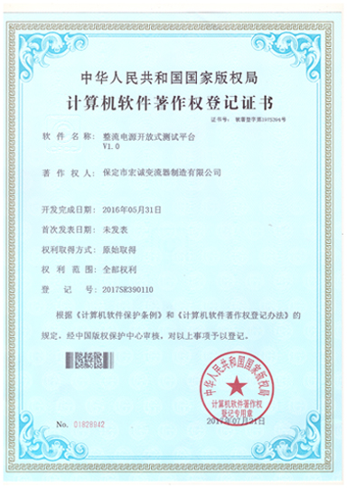 計(jì)算機(jī)軟件注冊(cè)權(quán)登記證書——整流電源開放式測(cè)試平臺(tái)V1.0