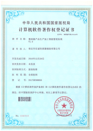 計(jì)算機(jī)軟件注冊(cè)權(quán)登記證書——整流器產(chǎn)品生產(chǎn)加工智能管理系統(tǒng)V1.0