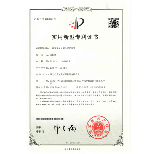 實(shí)用新型專利證書一種變速風(fēng)機(jī)驅(qū)動(dòng)保護(hù)裝置