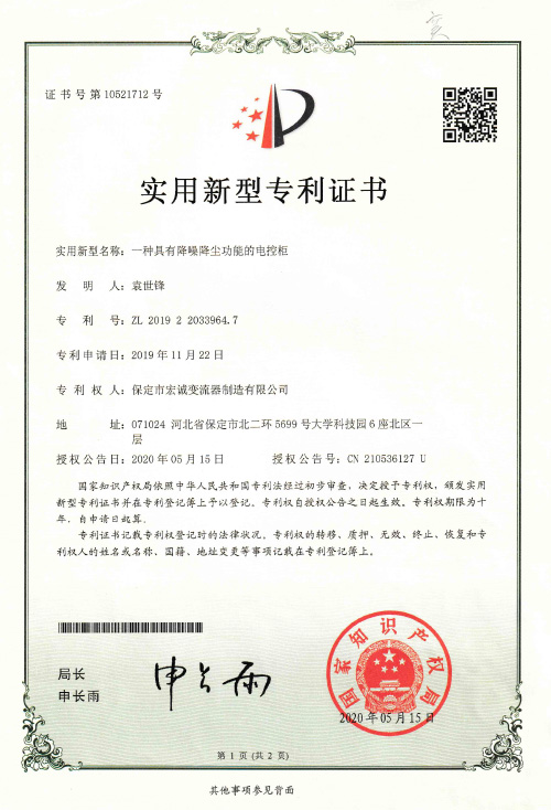實(shí)用新型證書一種具有降噪降塵功能的電控柜