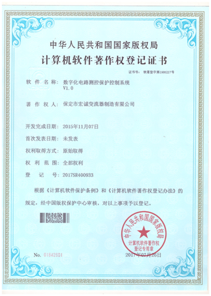 計(jì)算機(jī)軟件注冊(cè)權(quán)登記證書——整流電源過壓保護(hù)數(shù)據(jù)采集系統(tǒng)V1.0