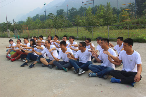 我們先進(jìn)行了拓展前的熱身活動(dòng),兩個(gè)簡(jiǎn)單的小游戲消除了大家彼此間的陌生感,活躍了氣氛。然后,大家被教練分成兩組,并被要求在半小時(shí)內(nèi)選出隊(duì)長(zhǎng),取隊(duì)名,定口號(hào),繪制隊(duì)旗,選定隊(duì)歌并擺出團(tuán)隊(duì)造型。大家都集思廣益,分工合作,各顯其能。